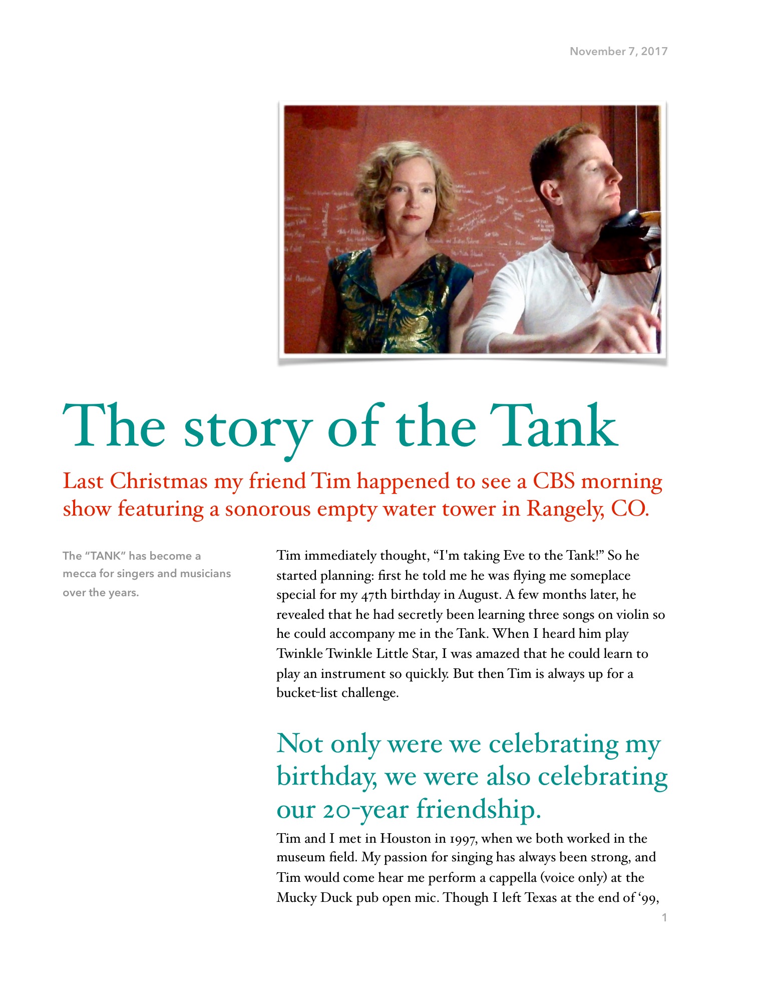 Here’s an excerpt from “The story of the Tank.” You’ll find more stories – as well as music, photos and videos – on the Echo Songs: Live from the Tank flash drive album. Buy now